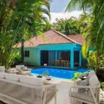 Step outside and be greeted by a lush, oversized garden that invites relaxation and outdoor activities, swim-up pool bar, wooden deck, and outdoor shower—perfect for entertaining guests or unwinding after a day in the sun.