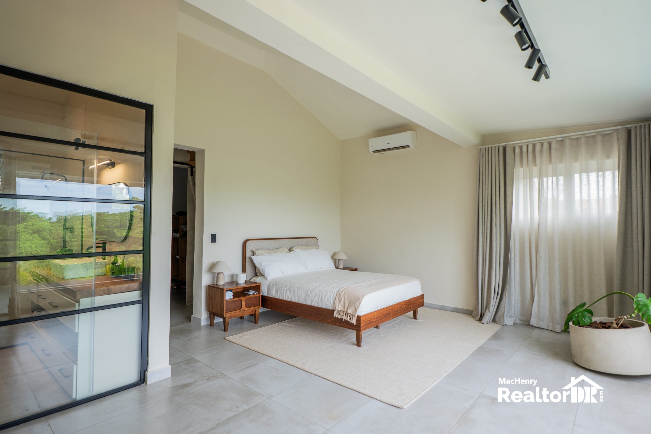 The entire upper level is dedicated to the master suite, a private sanctuary featuring a large window framing views of the lush jungle canopy and the sparkling ocean beyond.