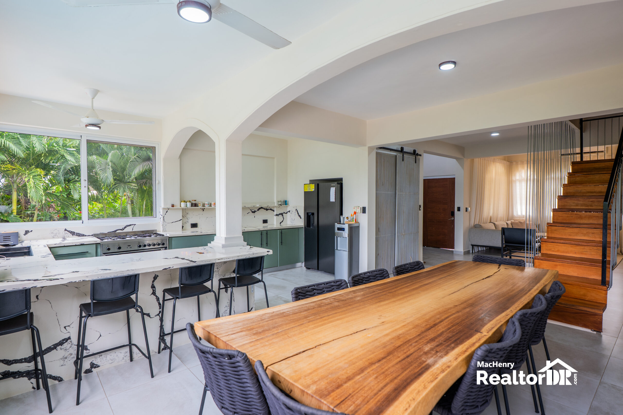 The open concept living and dining area flows naturally toward the private pool and tropical garden.