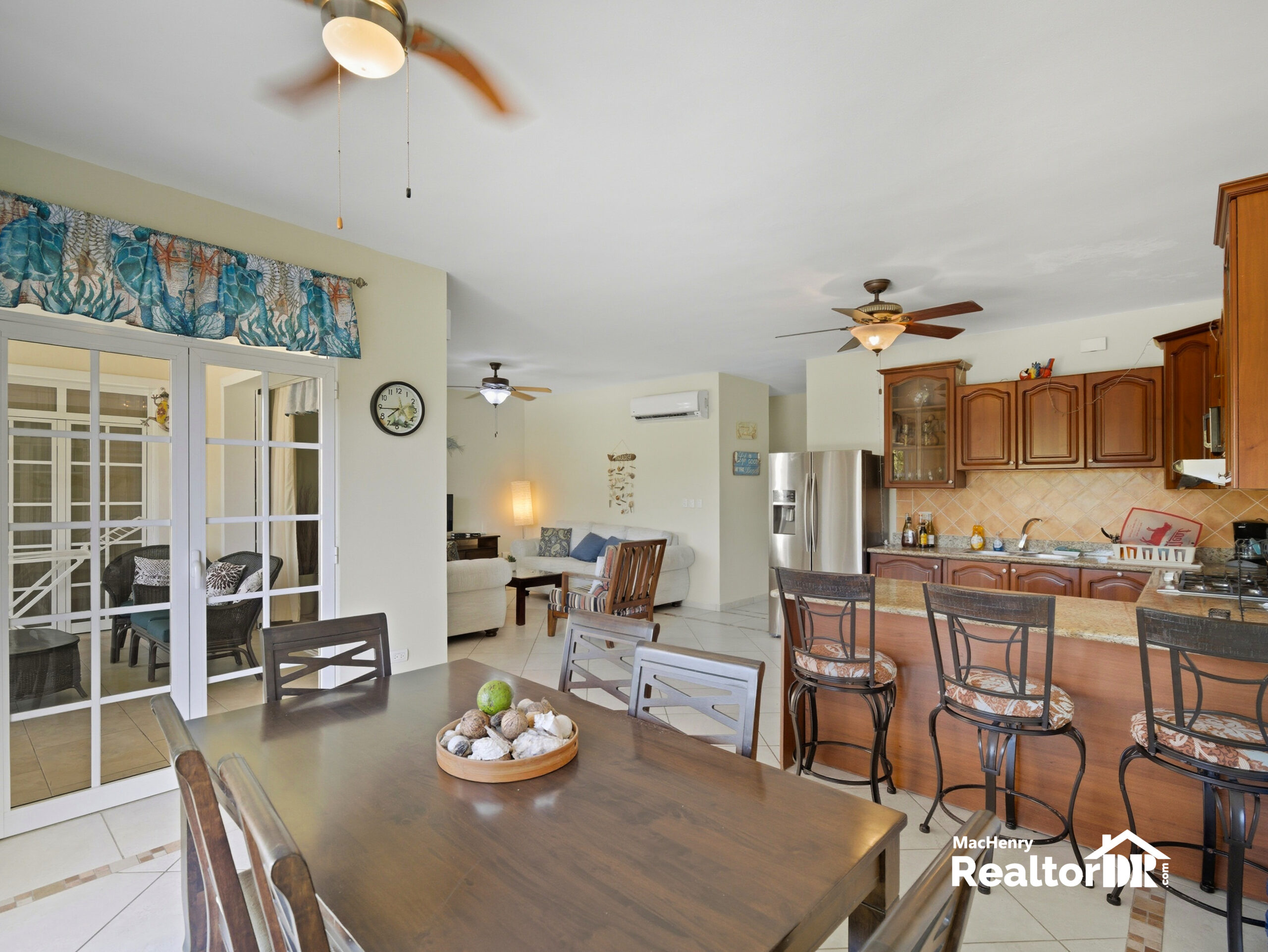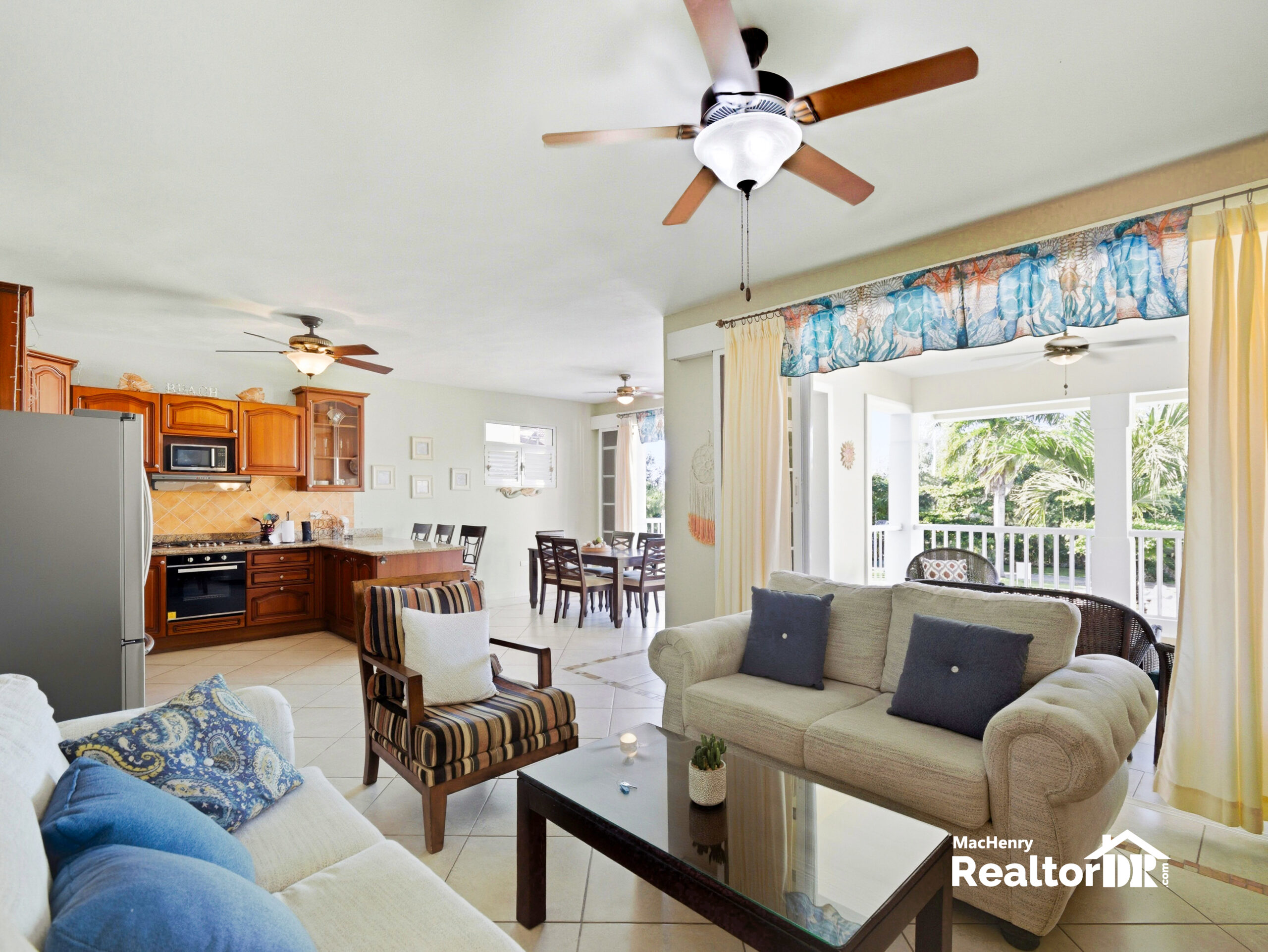 The condo offers an open-concept kitchen, dining, and living area that seamlessly connects to the main balcony/terrace through large pocket sliding doors, creating a wide-open feel and the perfect setup for Caribbean indoor-outdoor living.