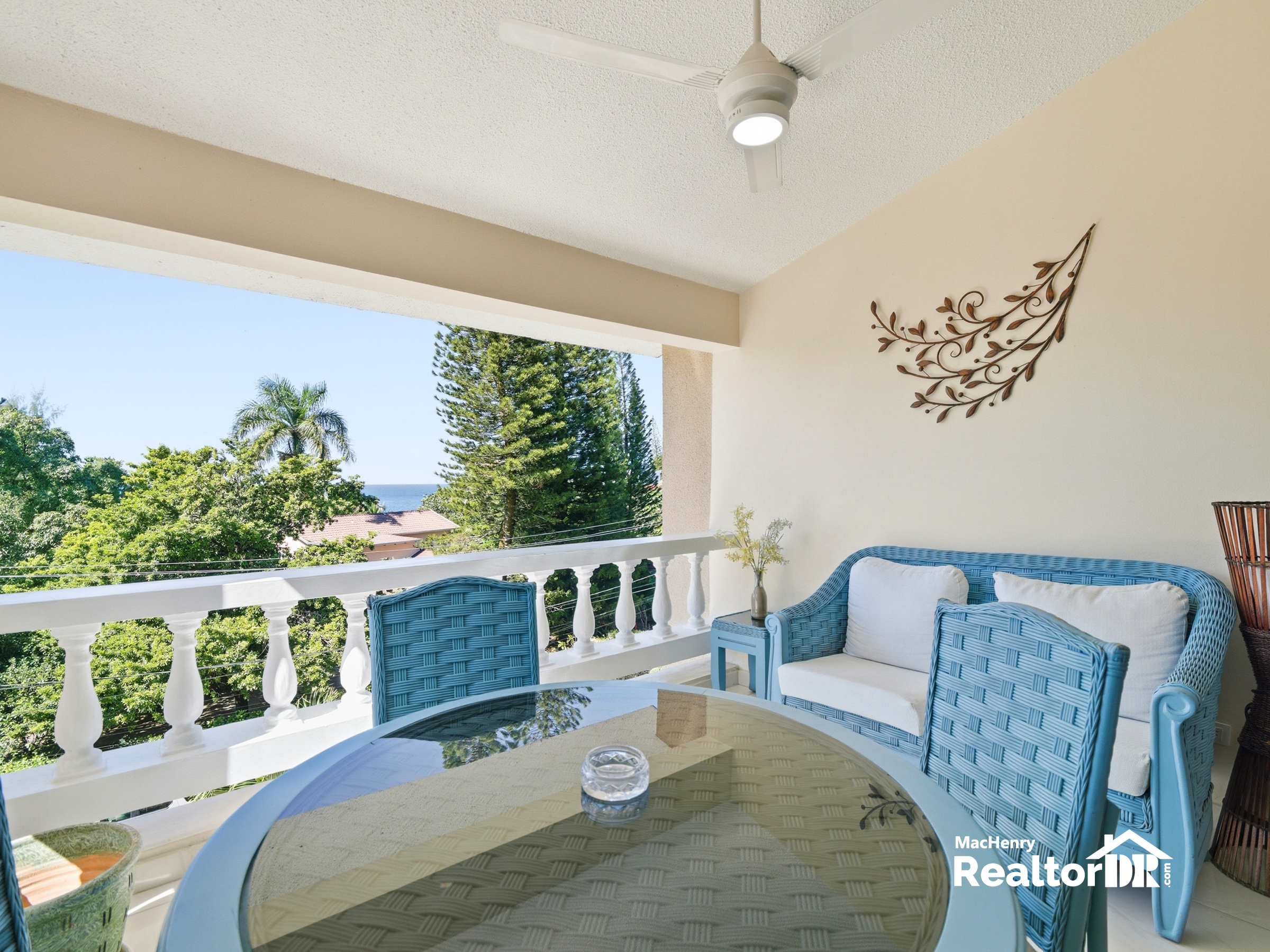 The condo offers 112 m² of interior space, comes fully furnished, and features ocean and mountain views from the living room, the balcony, and one of the two bedrooms. The elevated position allows for good airflow and natural light throughout the unit.