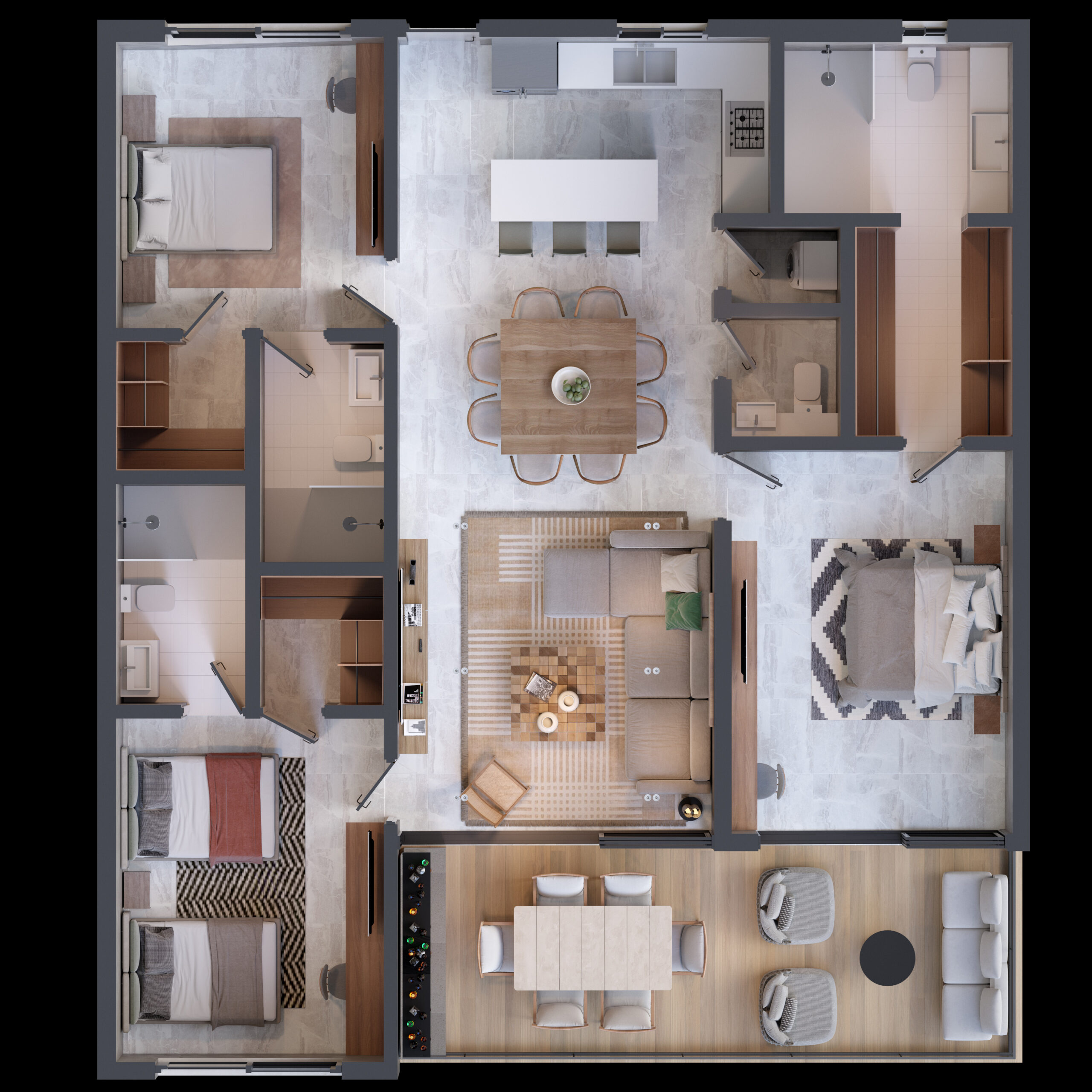 Luxurious Finishes: Imported marble and/or porcelain floors, precious wood doors, modular European kitchen, smooth cement walls, and German-engineered windows.